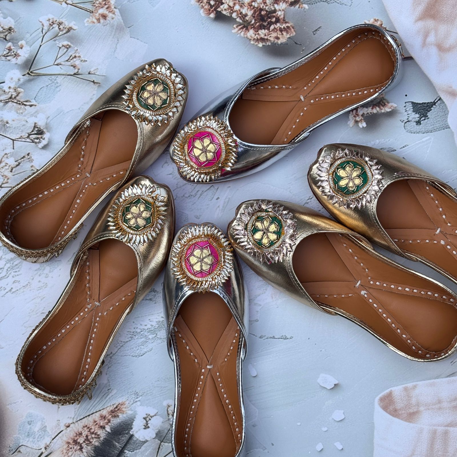 Step into the festive glow with our Gotta Glam Juttis — a stunning blend of elegance and tradition. Handcrafted in rich gold and silver tones, these juttis feature exquisite gotta patti embroidery that adds a touch of regal charm to every outfit. Designed for comfort and style, they’re perfect for weddings, festive gatherings, or any special celebration.