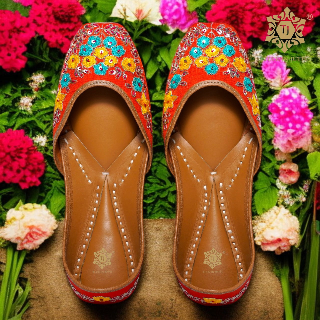 Say hello to Gulbahar Jutti, a vibrant celebration of colours inspired by a blooming spring garden. Handcrafted with intricate multi-coloured floral embroidery on a rich orange base, this pair brings festive warmth, charm, and elegance to your every step.